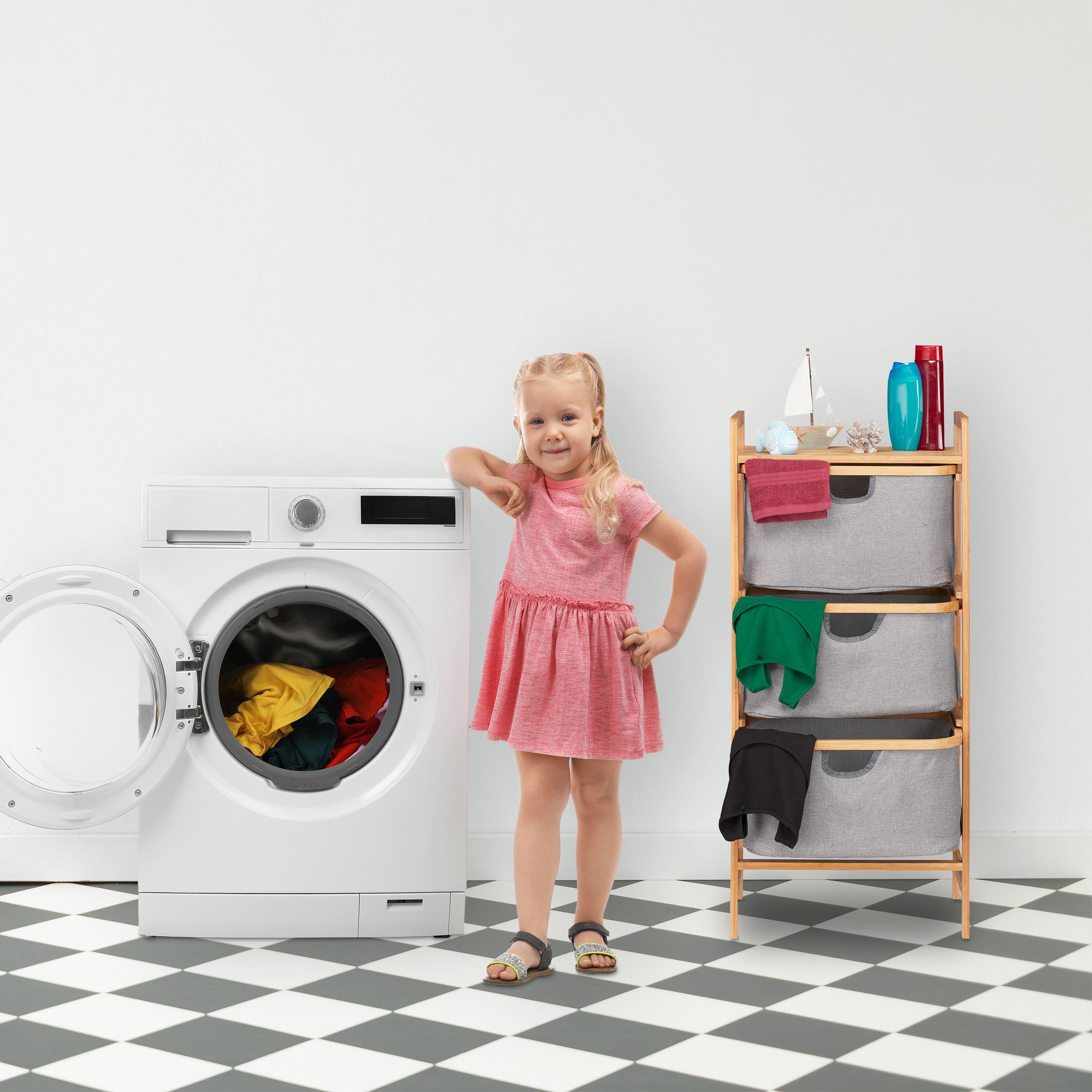 Helle, bunte und dunkle Wäsche wäscht man getrennt. Warum nicht gleich so im Wäschebehälter sortieren? Im Korbregal mit drei separaten Boxen bewahren Sie Schmutzwäsche farblich getrennt auf und sparen so Zeit bei der Hausarbeit. Dabei ist das Bambusregal vielfältig verwendbar. Im Schlafzimmer bietet es Stauraum für Socken, Medikamente und vieles mehr. Im Bad dagegen finden in dem Standregal Badutensilien wie Handtücher Platz. Der Ablagetisch auf dem Regal ist für Deko oder Kosmetika sinnvoll.