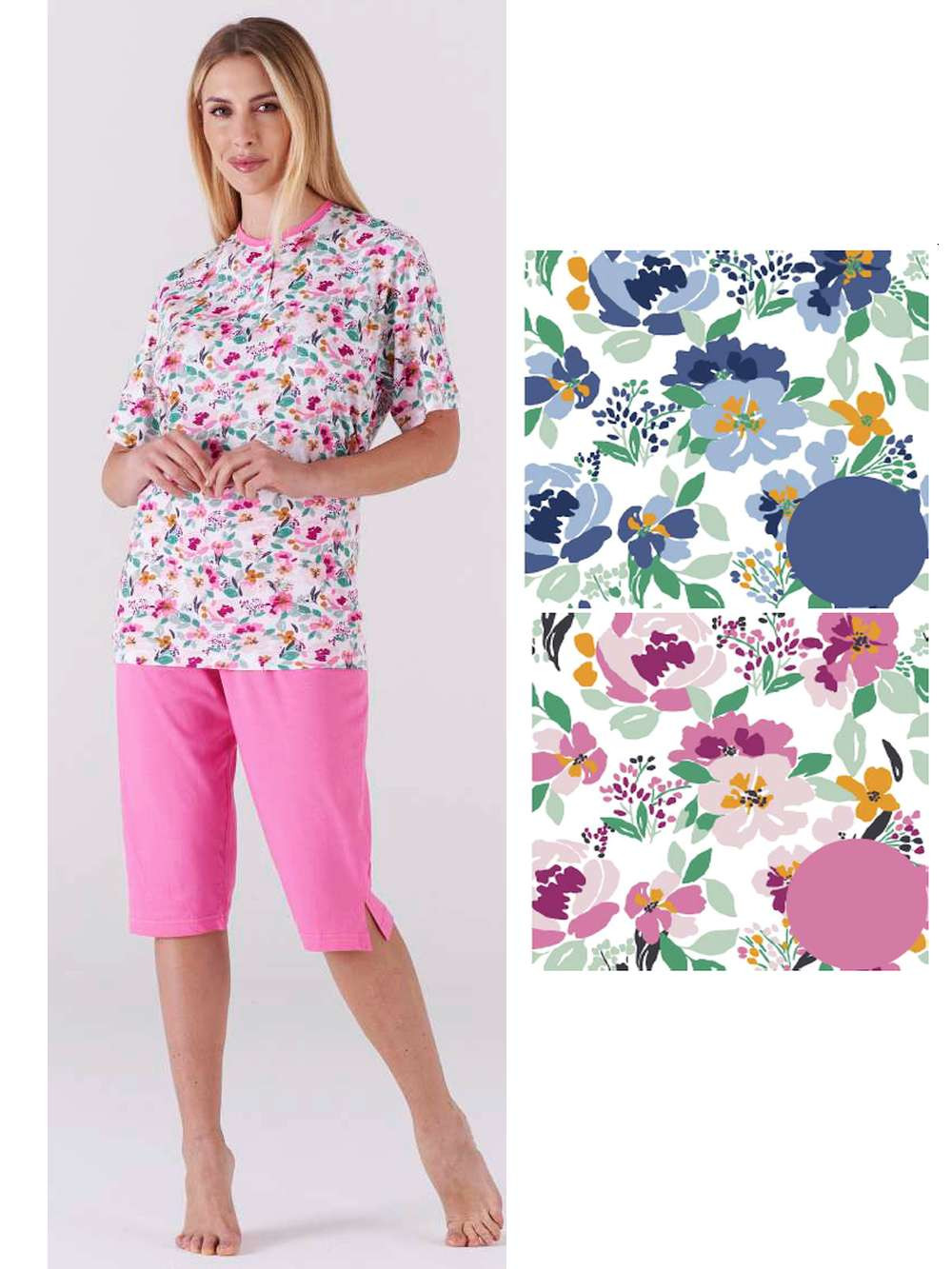 Pigiama donna a manica corta in jersey di cotone floreale e pantalone a pinocchietto tinta unita.