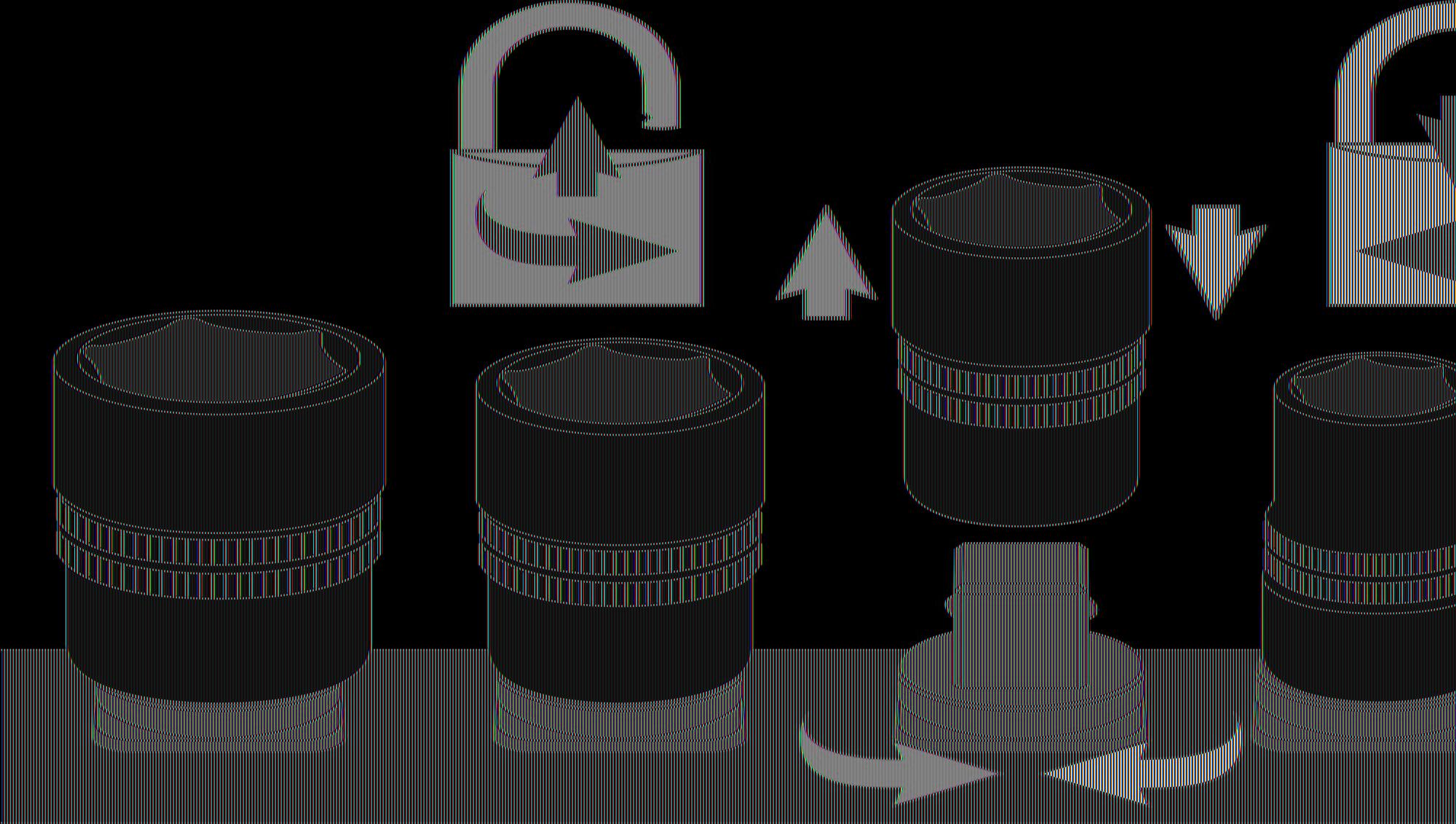 - Im geschlossenen Zustand sind alle Teile sicher arretiert Herausfallen unmglich. Zur Entnahme Steckschlsseleinsatz drehen und nach oben abziehen