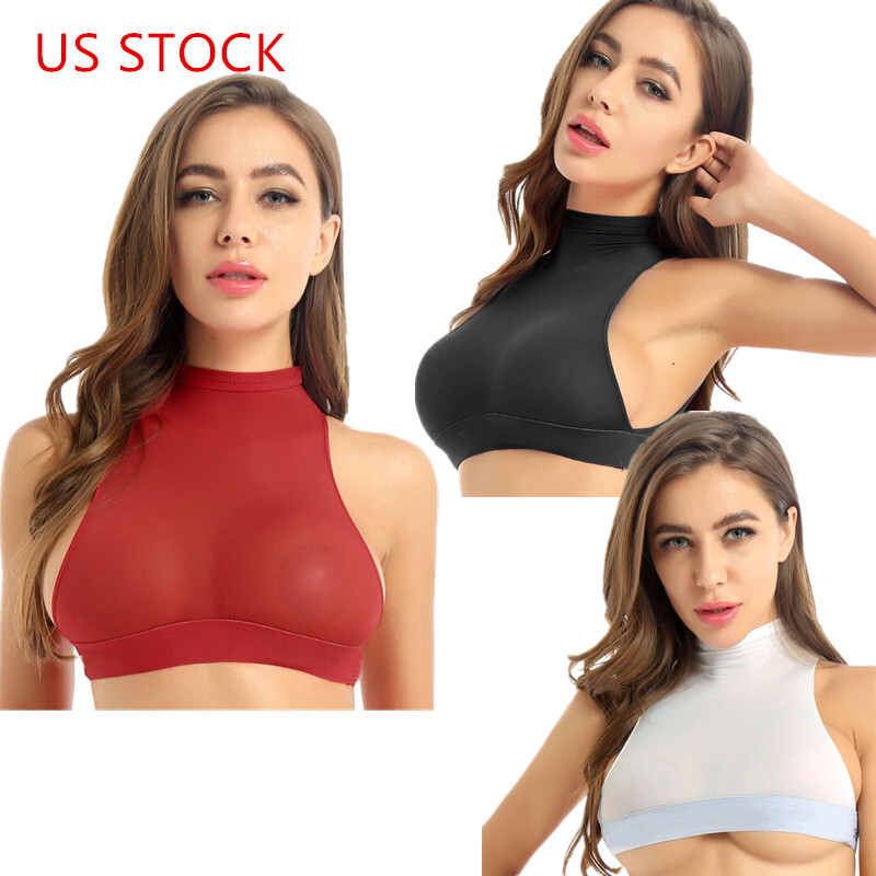 Women’s sheer mesh bralette, unlined triangle cup, stretchy fabric.