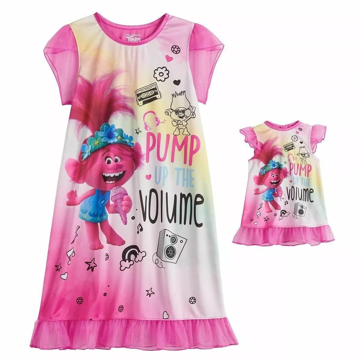 A super cute and colorful Trolls Poppy 'Pump Up The Volume' themed graphic. Features a satin pink stretch collar and pretty pink tulle short sleeves. A ruffled tulle hemline adds to the charm. Of a lightweight, silky fabric. Includes a matching gown that fits up to an 18" doll 100% Polyester