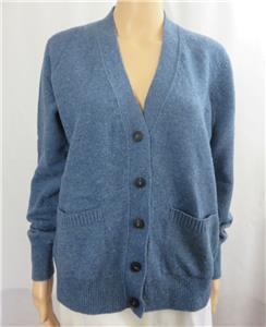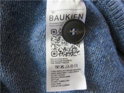 We are offering a pretty Baukjen llght blue cardigan sweater. This long sleeve button down knit cardigan has two front pockets and v neckline. Recycled wool Blend. SZ US 8 UK 12.