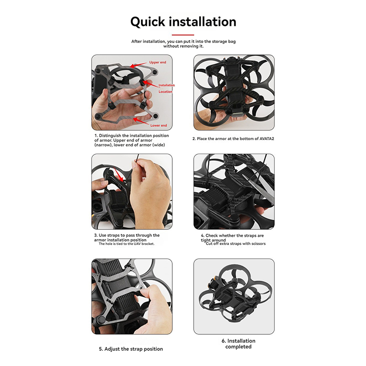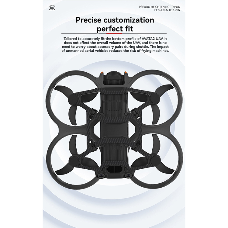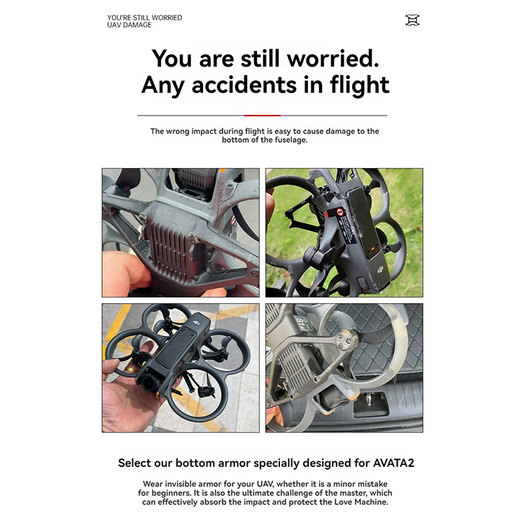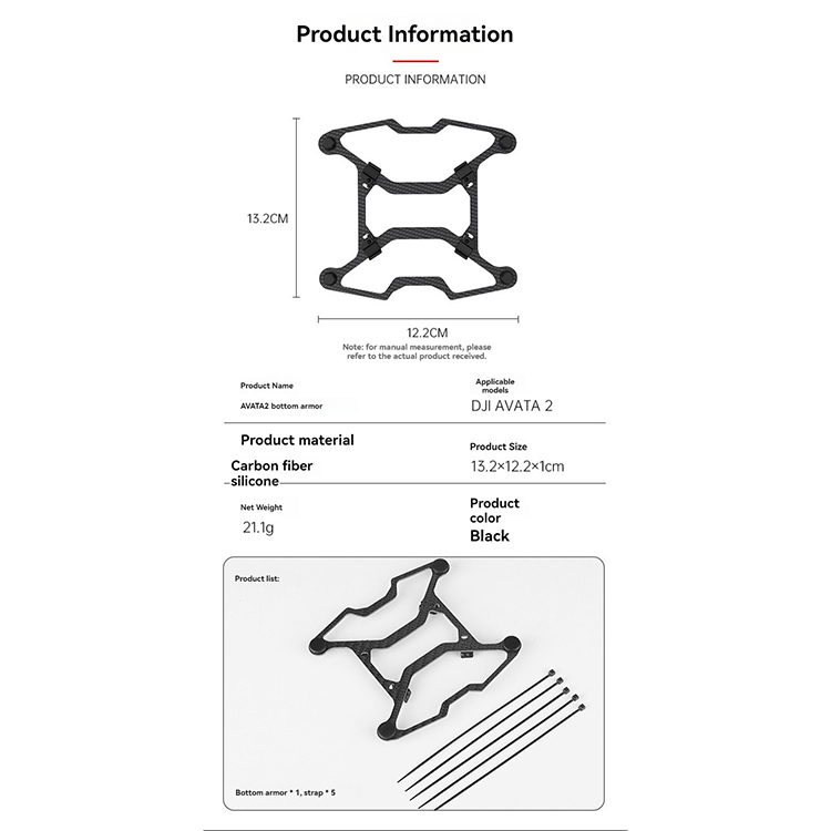 Features: l Safety protection, no fear of collision. Open your extraordinary flight experience l The wrong impact during flight is easy to cause damage to the bottom of the fuselage l The bottom armor is carefully designed to resist Accidental Impacts and scratches. Provides an indestructible bottom line of defense for every flight crossing and challenge l Silicone protective non-wear machine. Soft silicone attached on both sides will not scratch the drone body. Ensure the safety and stability of each takeoff and landing l It is made of high quality carbon fiber and has corrosion resistance. Wear resistance, long-term use is not easy to deform l Cable tie fixed design, simple and easy to use, when high-speed flight or complex terrain landing. It can also ensure that the bottom armor is stable and does not shift Specification: l Material: Carbon Fiber l Color: Black l Type : Chassis Armor l Size: As shown l Applicable Model: for DJI AVATA2 Package: l Bottom Armor x 1 + Strap x 5