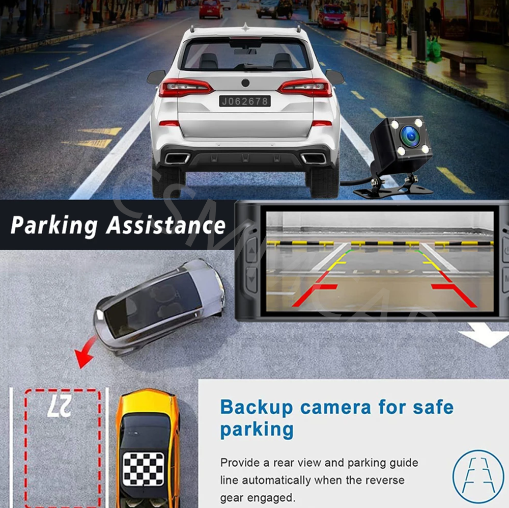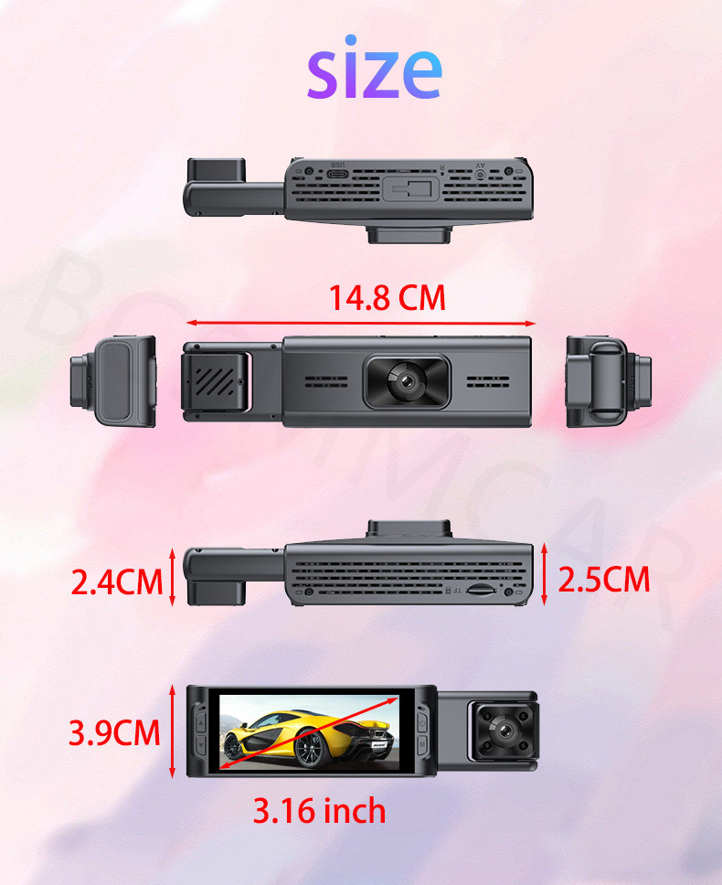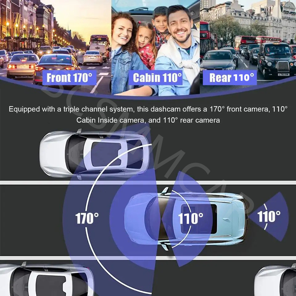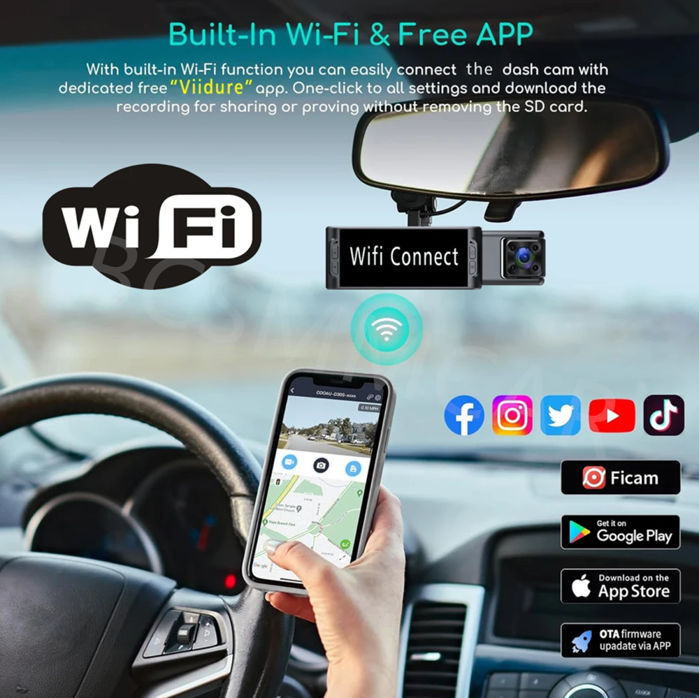The new high-definition 3-lens dash cam features built-in WiFi support for iPhone and Android phone connectivity, making it easy for your phone to view videos.