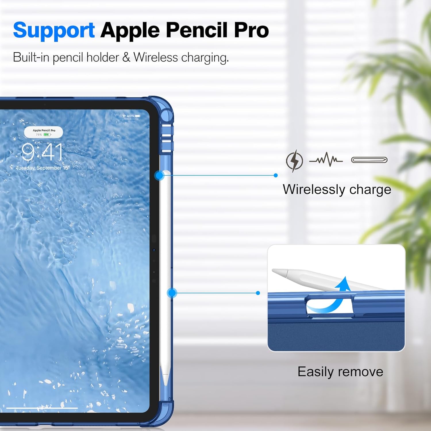 Seamlessly supports Apple Pencil Pro magnetic and wireless charging when case is on. Built-in Pencil holder securely carries and protects your Apple Pencil Pro wherever you go. A hole is designed behind the holder for pushing your pencil out easily. (Case only, other accessories not included!)