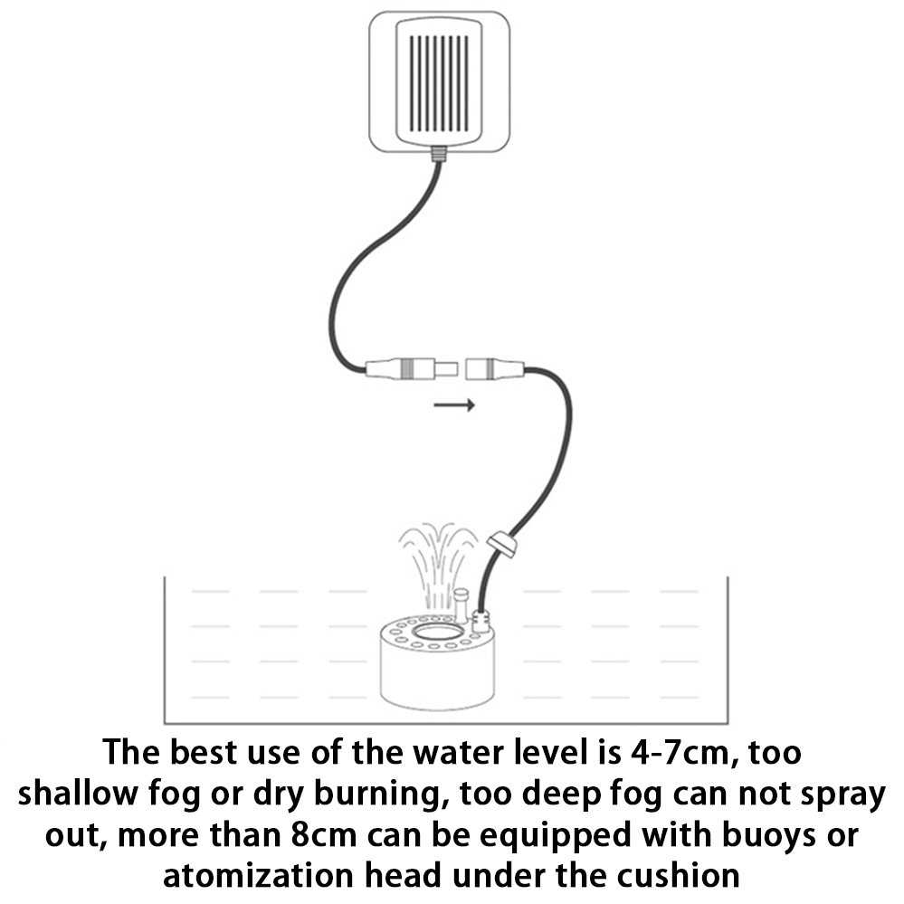 - Plug and play, put in the 3-7cm depth water and the voltage is 24V, then the mist appears.