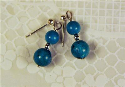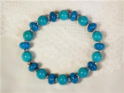 Created turquoise beads with 8 mm focal bead on silver plated hoops. Includes drawstring gift bag. Matching pieces pictured are sold separately.