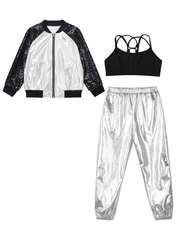 Kids Girls Tracksuits Sports Set Metallic Outfits Jazz Pants Hip Hop Jacket