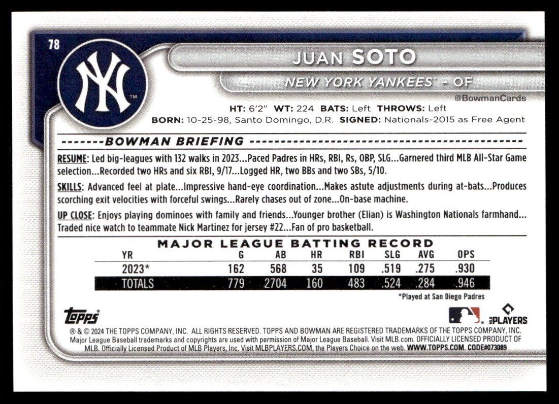| Juan Soto 2024 Bowman Card | #78 New York Yankees |