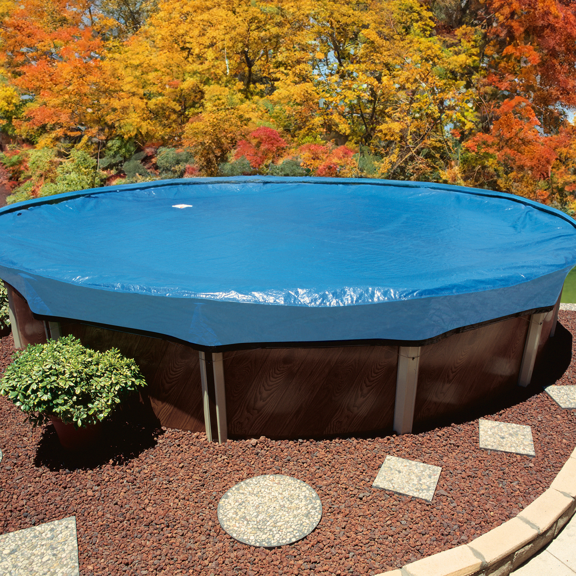 - Discount winter above ground pool covers are navy blue in color with a black underside to inhibit algae growth.