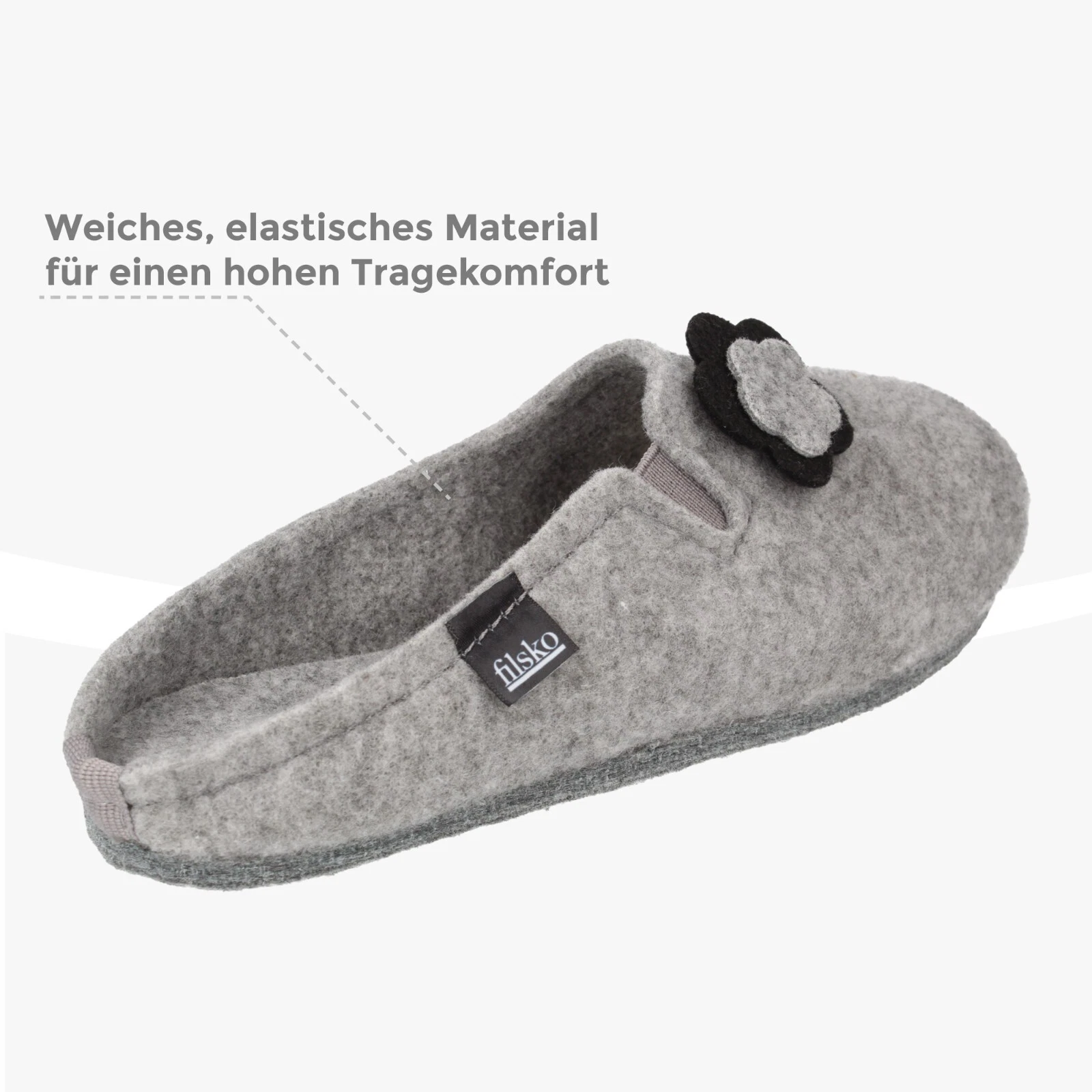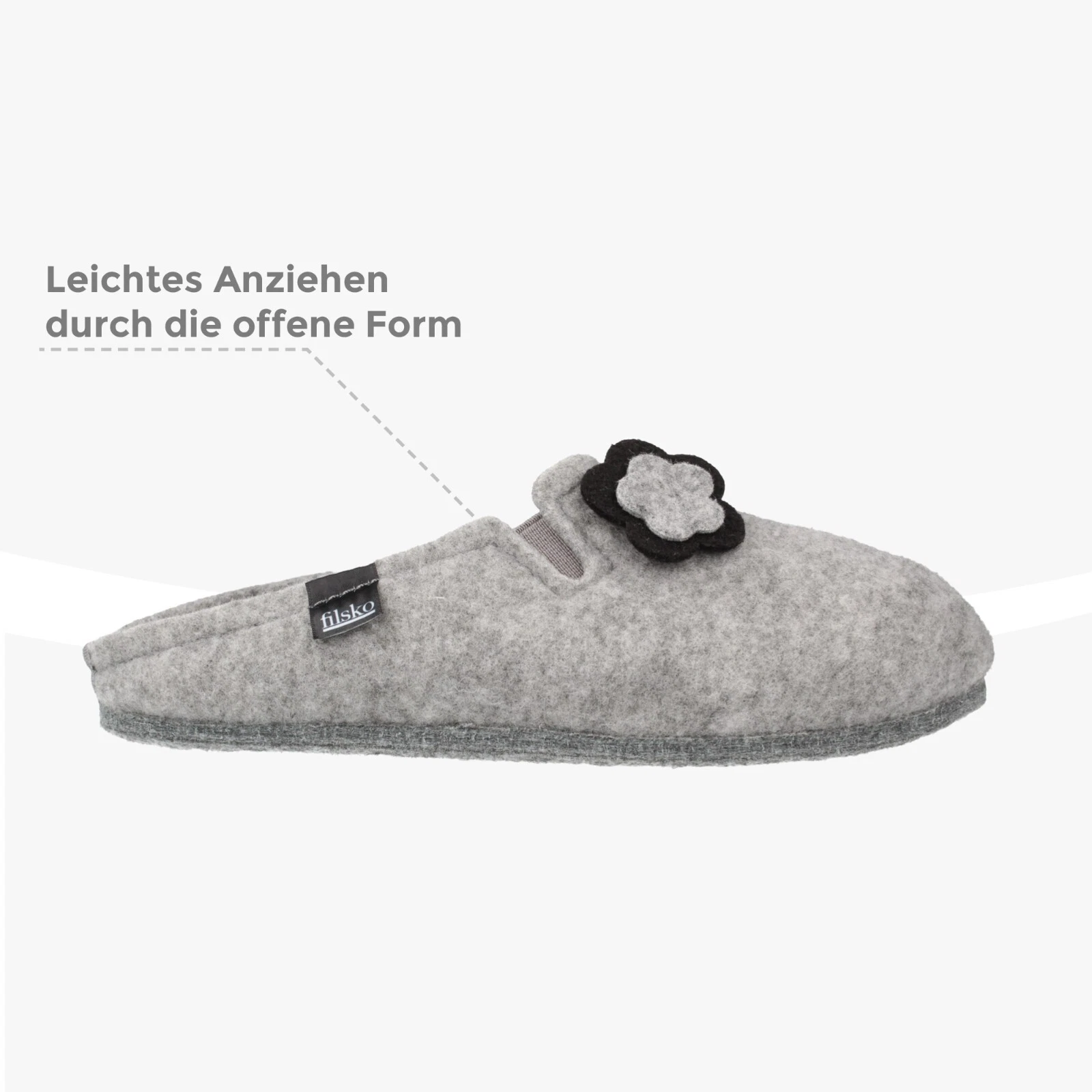 👆 Modischer Look: Das Obermaterial, der bequemen Hausschuhe, besteht aus grauem Easy-Filz und sticht mit seiner Blumenapplikation hervor.