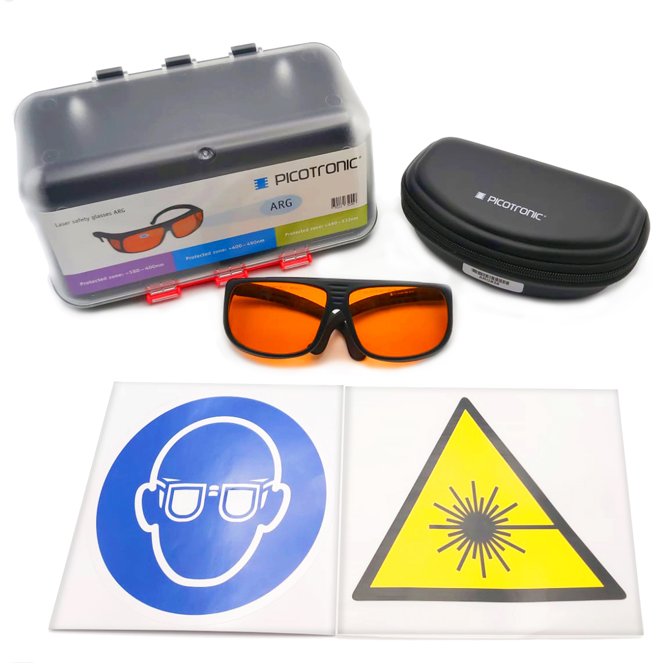 Laserschutzbrillen-Set, zertifiziert nach DIN EN207, 400-532nm. Zum Laserschweißen, Laserschneiden, Lasermarkieren, Kosmetik. Sichere Aufbewahrung durch Wandhalter. Inkl. Warn- und Gebotszeichen
