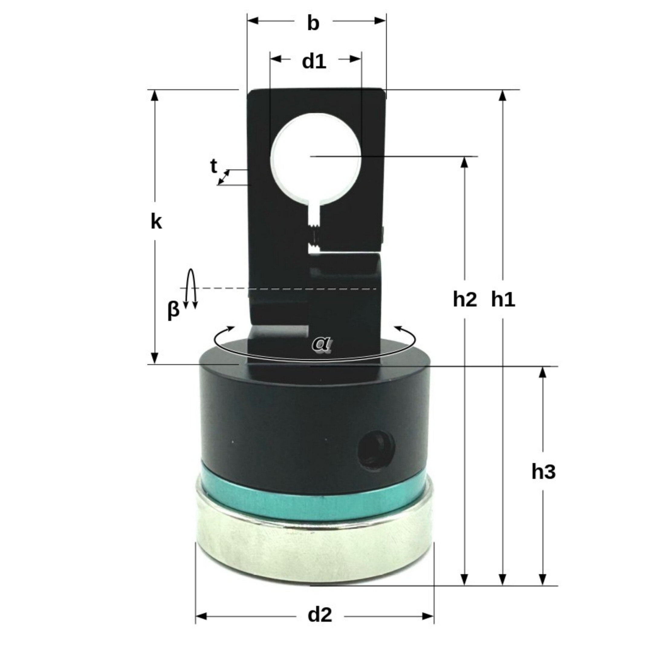 Professionelle Magnet-Halterung in Industriequalität für Lasermodule mit einem Durchmesser von 9mm. Die Halterung ist in allen Freiheitsgraden einstellbar. Der magnetische Standfuß erlaubt eine schnelle und unkomplizierte Befestigung auf allen ferromagnetischen Materialien, Oberflächen und Blechen wie z.B. an Maschinen, Sägen, Estrichfräsen, Fliesenschneidern, Bohrmaschinen, Werkzeugen, usw. Die Haltekraft beträgt 65 kg und die Magnethalterung ist nur mit sehr großer Kraft überhaupt wieder von der Oberfläche zu entfernen. Die Gesamthöhe dieser Halterung beträgt 86 mm. Die Magnethalterung verfügt über eine fest aufgeklebte Gummibeschichtung auf der Unterseite welche ein Verrutschen des Magnetfußes sicher verhindert, dies auch bei sehr starken Vibrationen an der Maschine.