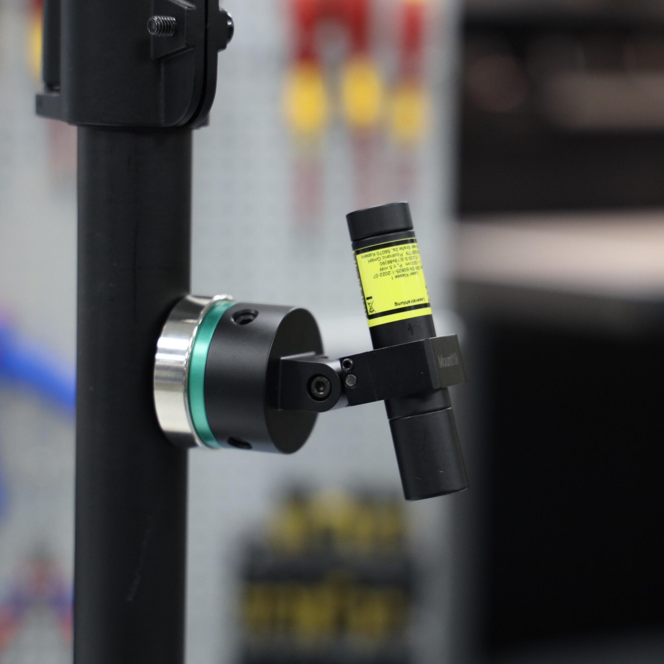 - Das Lasermodul wird mit einer Klemmschraube in der Halterung fixiert. Der farbige Standfuß wird mit Hilfe von drei Inbusschrauben mit dem Mount verbunden.