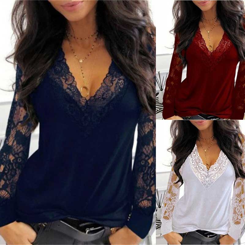 Blouse Ladies Womens V-neck Tops Casual Pullover Lace Long Sleeve T-shirt