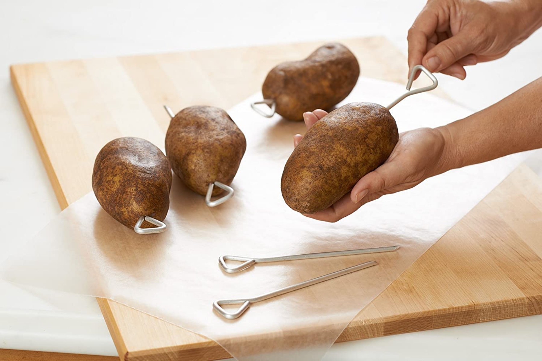 Using these 6.25" long heat conductive aluminum baking rods can substantially cut down on the baking time for potatoes. A potato baking rod hastens the baking process because heat is conducted to the center of the potato as well as the outside, causing more uniform baking.