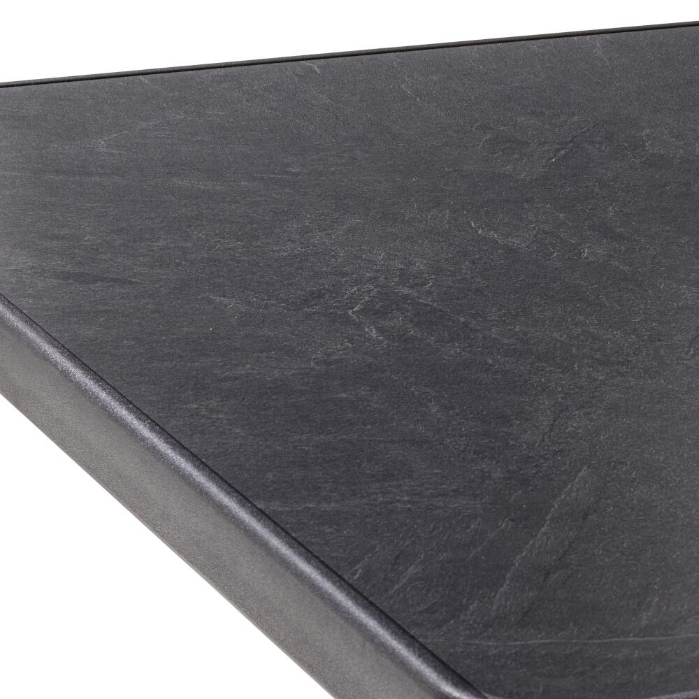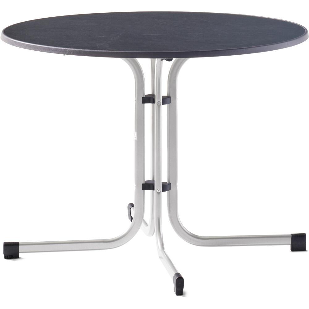 Der Tisch 236/A hat ein Gestell aus graphitfarbenem polyesterbeschichtetem Stahl-Flachovalrohr mit einer Rohrstärke von 35 x 20 mm, sowie eine anthrazitfarbene Original mecalit®-Pro Schieferdekorplatte mit eisengrauem Strukturrand. Durch die Polyesterbeschichtung wird das Gestell unempfindlich gegen Witterungseinflüsse. Die Höhe des Tisches beträgt ca. 72 cm. Damit der Tisch auch auf unebenen Flächen einen festen Stand hat wurde er mit einem Höhenausgleich ausgestattet. Durch seine Klappfunktion ist der Tisch sehr einfach in der Handhabung. Ein weiterer Pluspunkt für diesen Artikel ist, dass er montagefrei geliefert wird. So können Sie den Tisch sofort nach Erhalt problemlos in Gebrauch nehmen. Der Tisch kann ideal mit Möbeln aus dem SIEGER-Sortiment kombiniert werden. Bei diesem Artikel profitieren Sie von der jahrzehntelangen Erfahrung die SIEGER bei der Herstellung von Gartenmöbeln vorweisen kann.