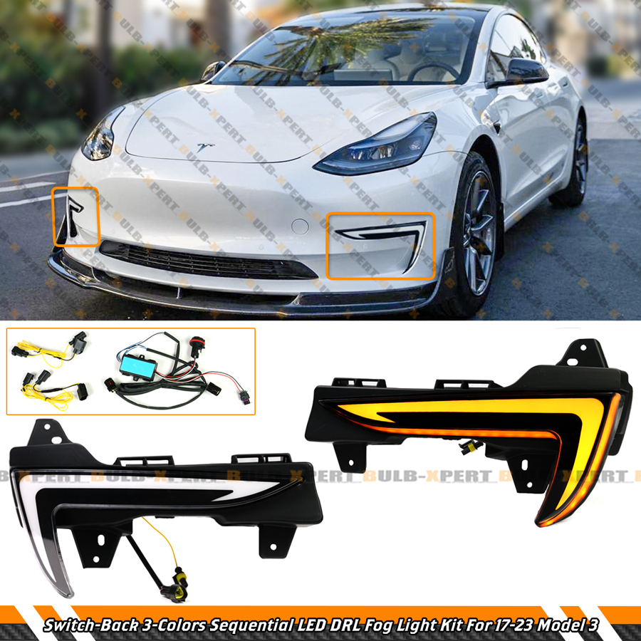 New Released Sequential Switch-Back Tri-Color DRL LED Replacement Fog Light Kit + Plug & Play Harness For Tesla Model 3.