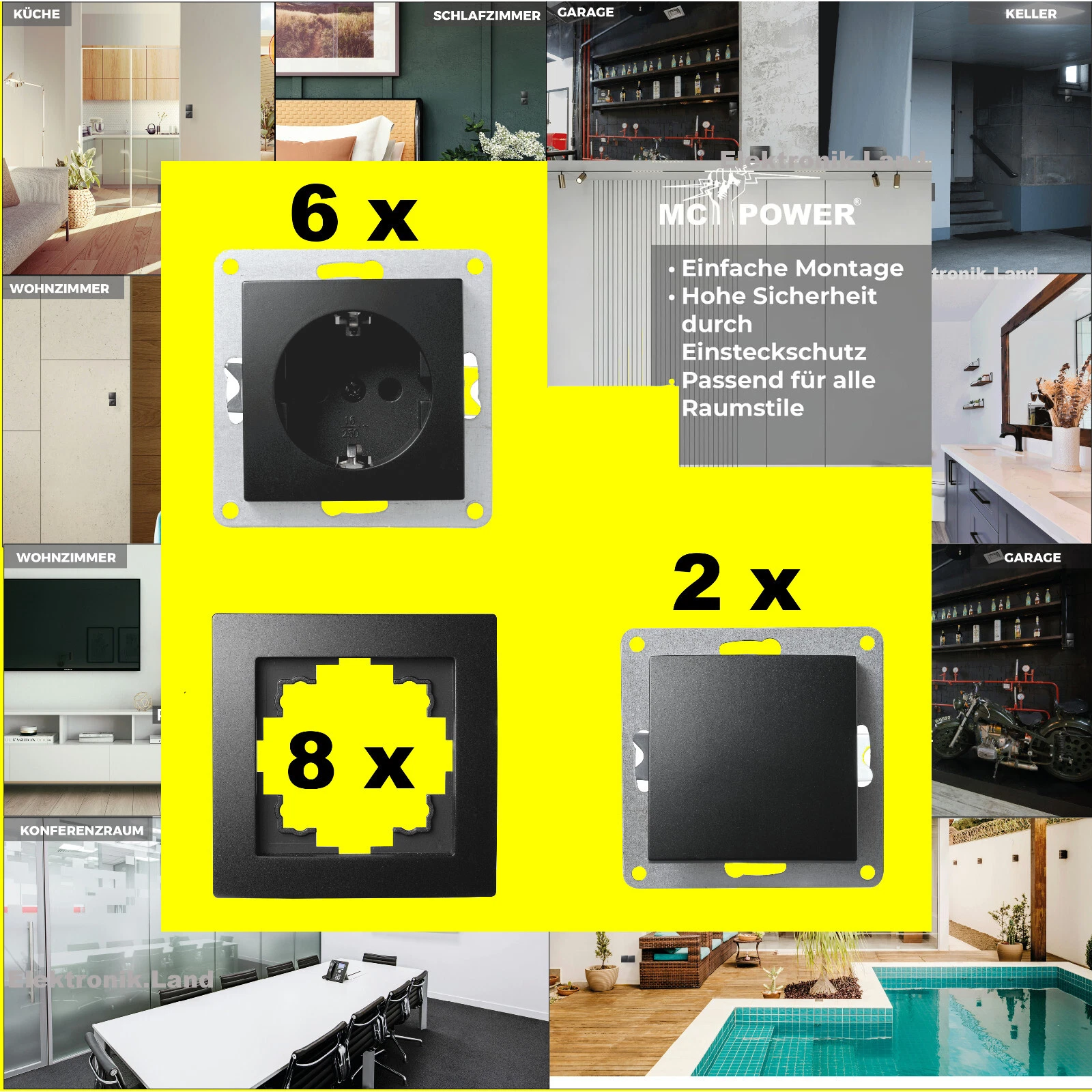 NR.51 | Schalter und Steckdosen Set Flair "STANDARD PROFI" - 20-TEILIG - STECKANSCHLUß - McPower, matt schwarz, EL-SET-101