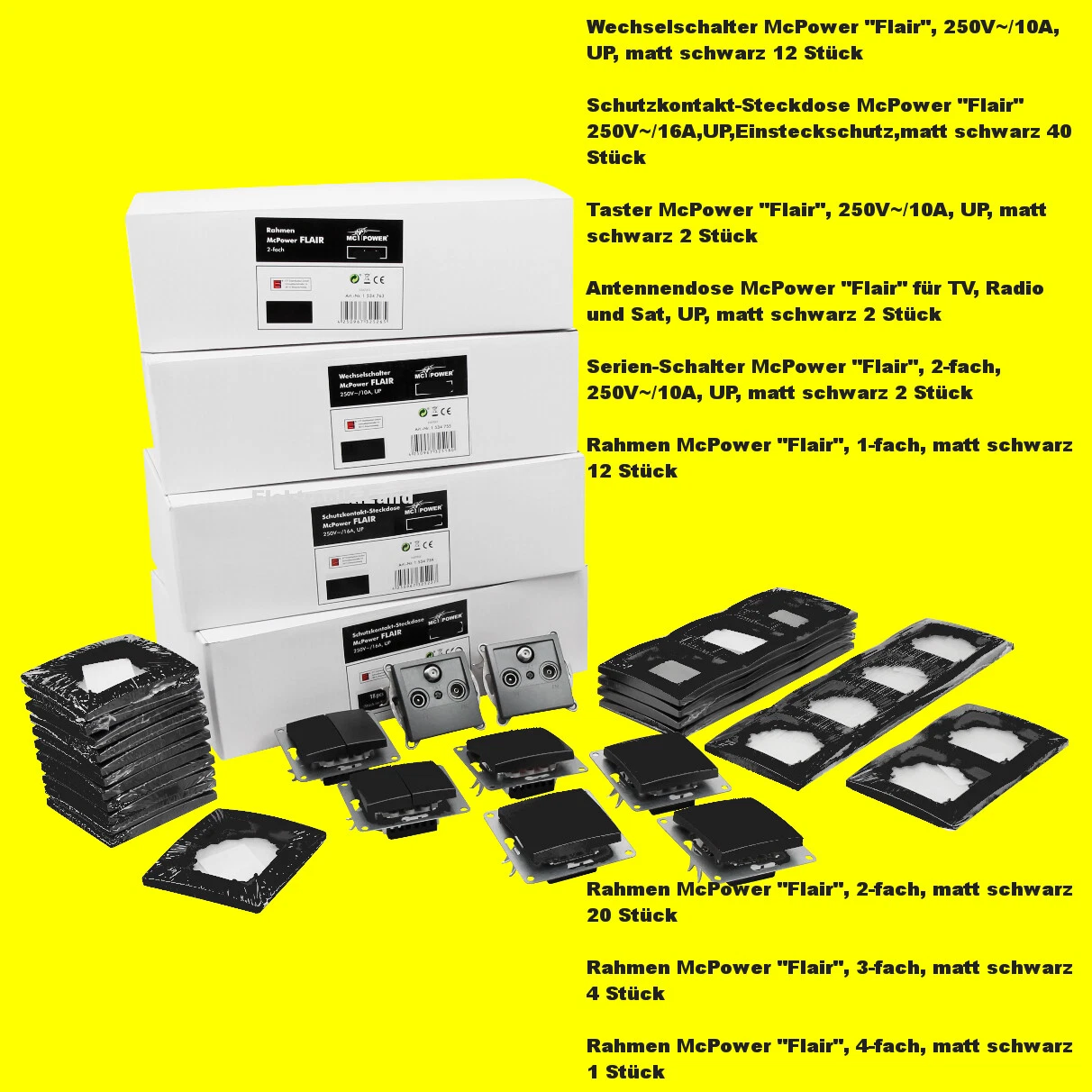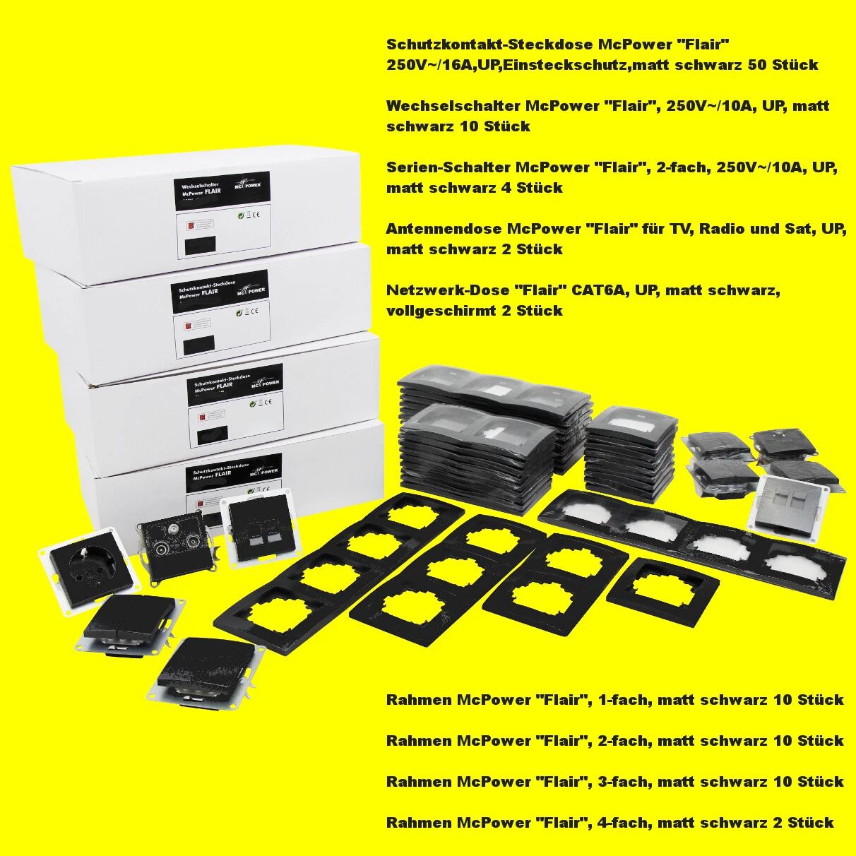 NR.42 | Schalter und Steckdosen Set Flair "MEGASET" - 100-TEILIG - McPower, matt schwarz, 1535894