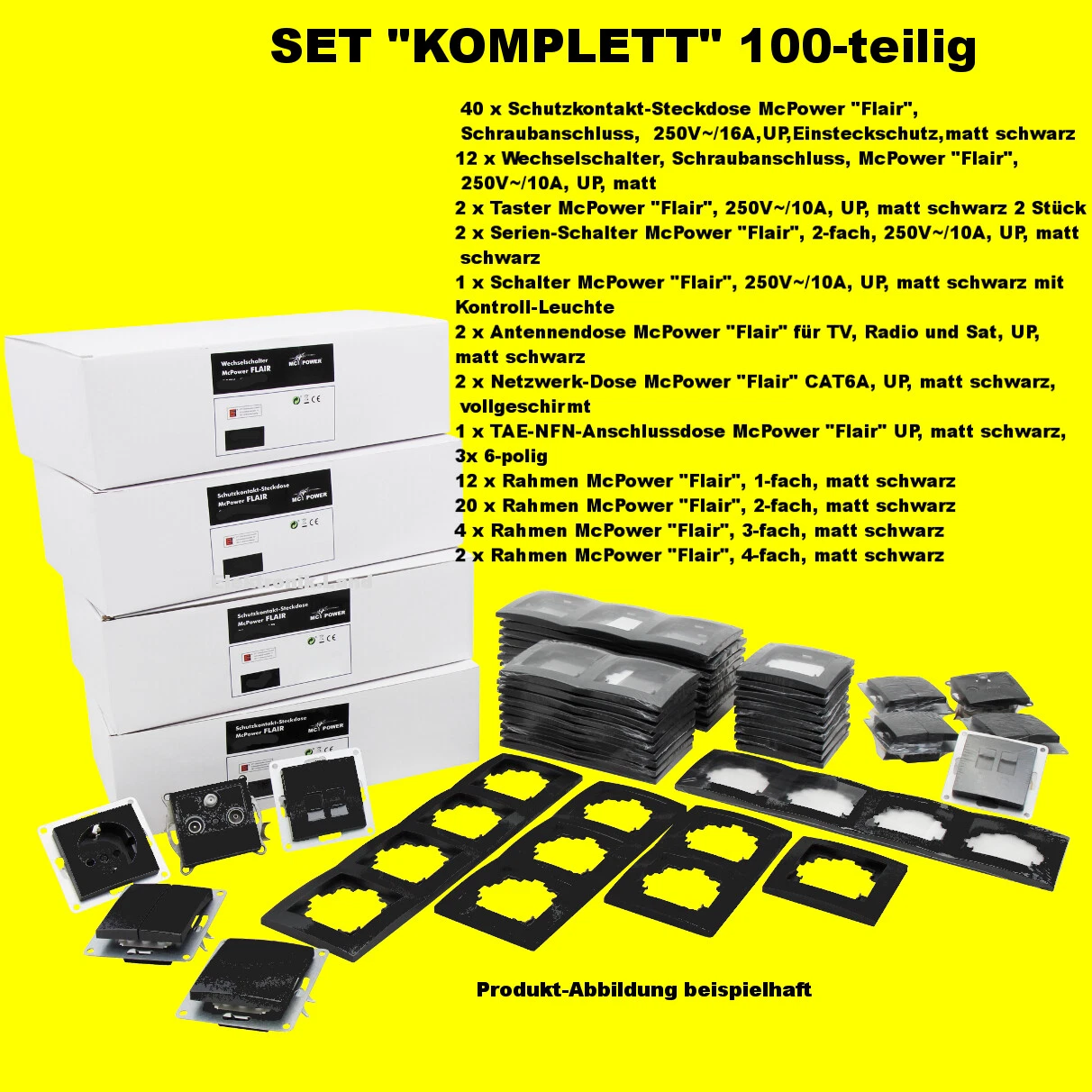 NR.46 | Schalter und Steckdosen Set Flair "MEGASET-PROFI" - 100-TEILIG - McPower, STECKANSCHLUSS, matt schwarz, 1535895