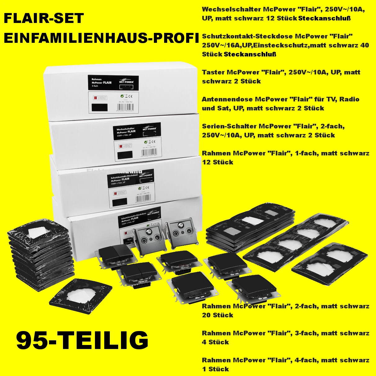 NR.45 | Schalter und Steckdosen Set Flair "EINFAMILIENHAUS-PROFI" - 95-TEILIG - McPower, STECKANSCHLUSS, matt schwarz, EL-SET-95