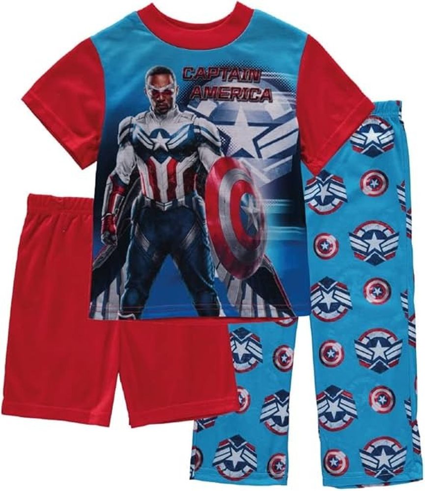 He'll love heading off to bed in this 3-Piece Marvel Falcon Winter Soldier Pajama Set when he's in the mood for some superhero style. The short-sleeved pajama top features an illustration of Falcon, Sam Wilson, as the new Captain America, and it's accompanied by blue pajama pants with the new Captain America logo print. Additionally, this boy's printed PJ set comes with red pajama shorts to give him more sleepwear options. Crafted of a soft and cozy polyester jersey fabric to keep him in supreme comfort during his superhero ventures!