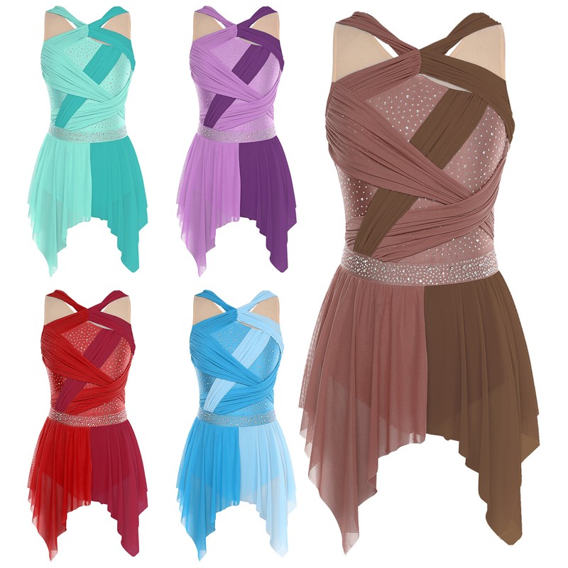 Womens Dress Competition Leotard Chiffon Rhinestone Party Lyrical Flowy SplitUSD 8.99