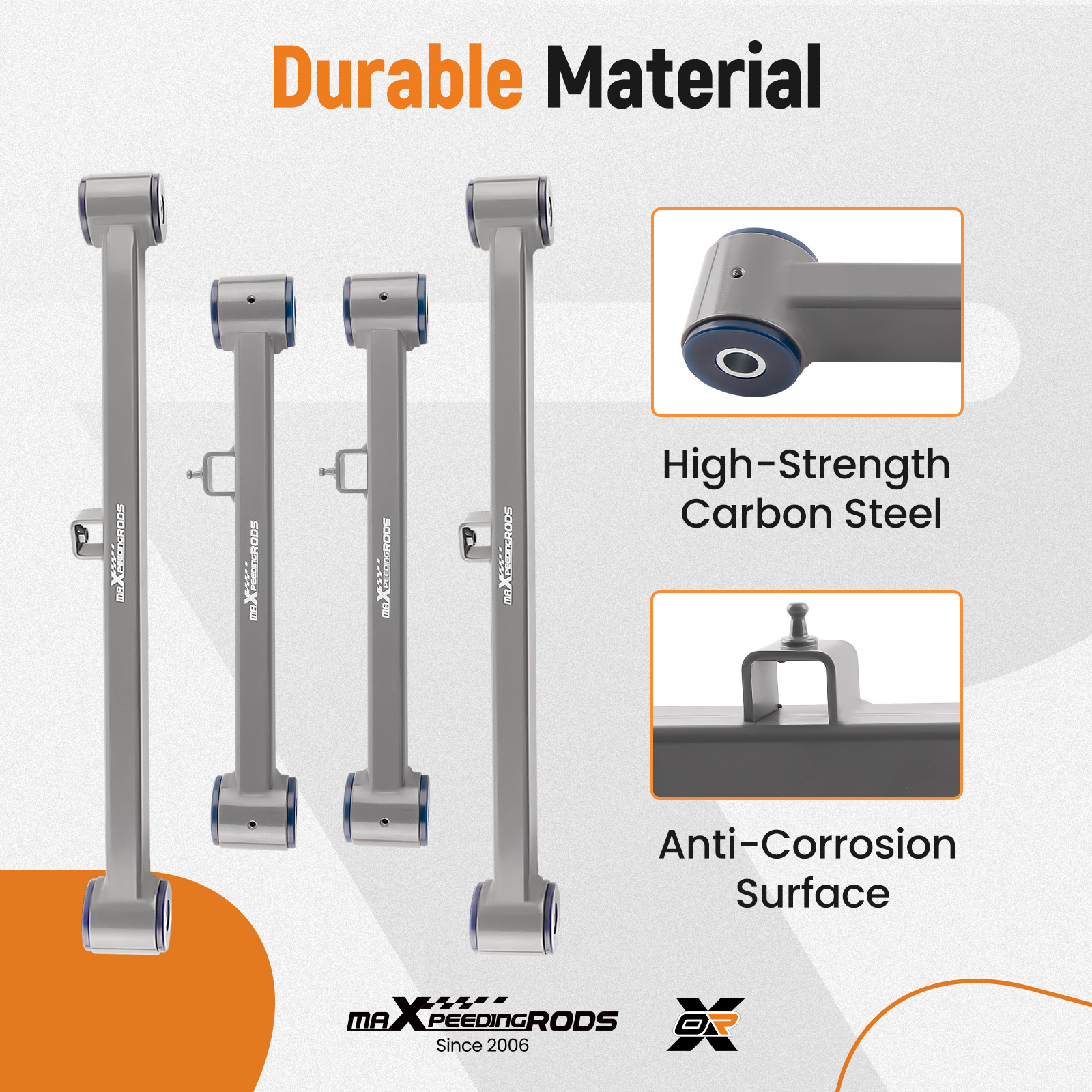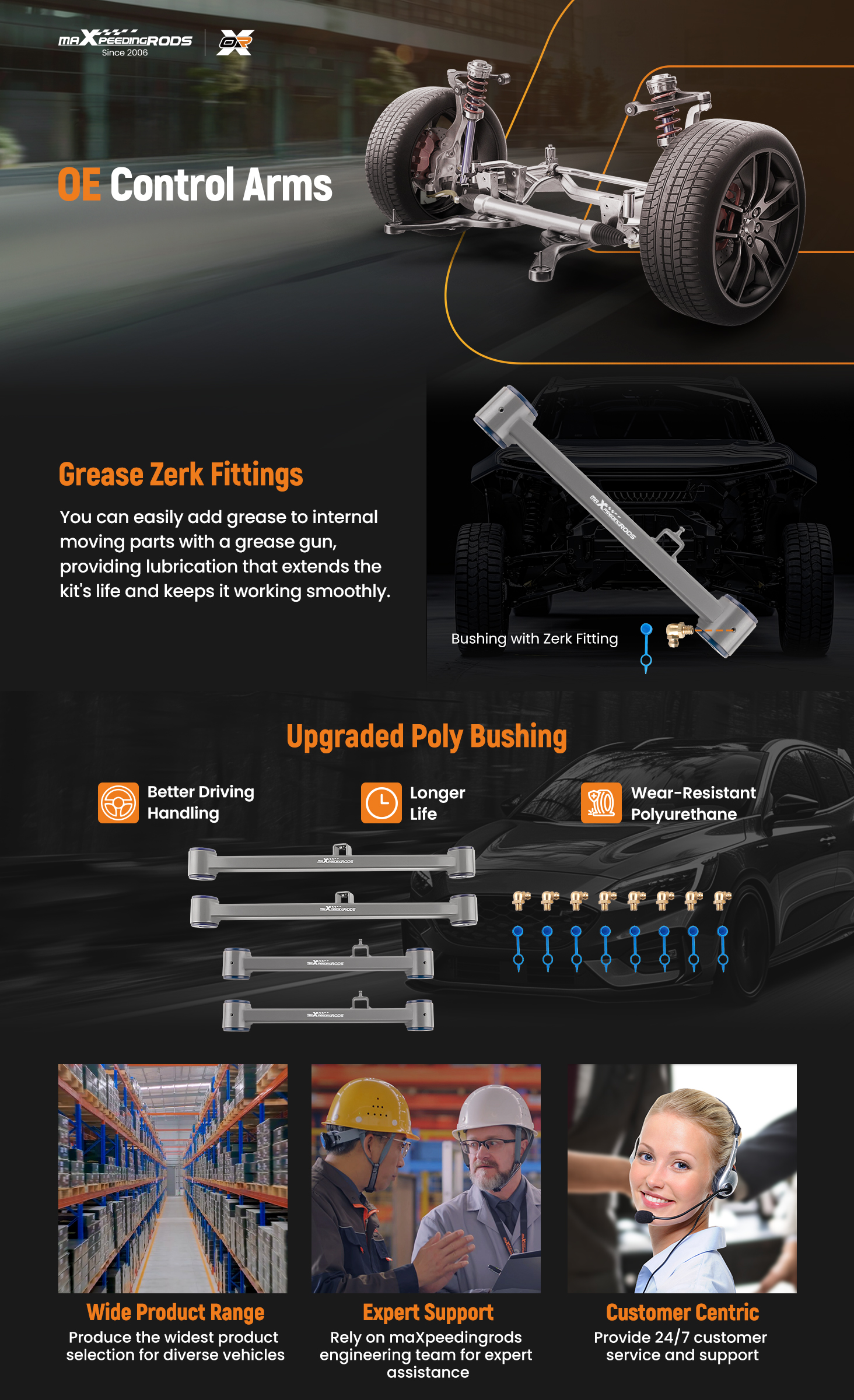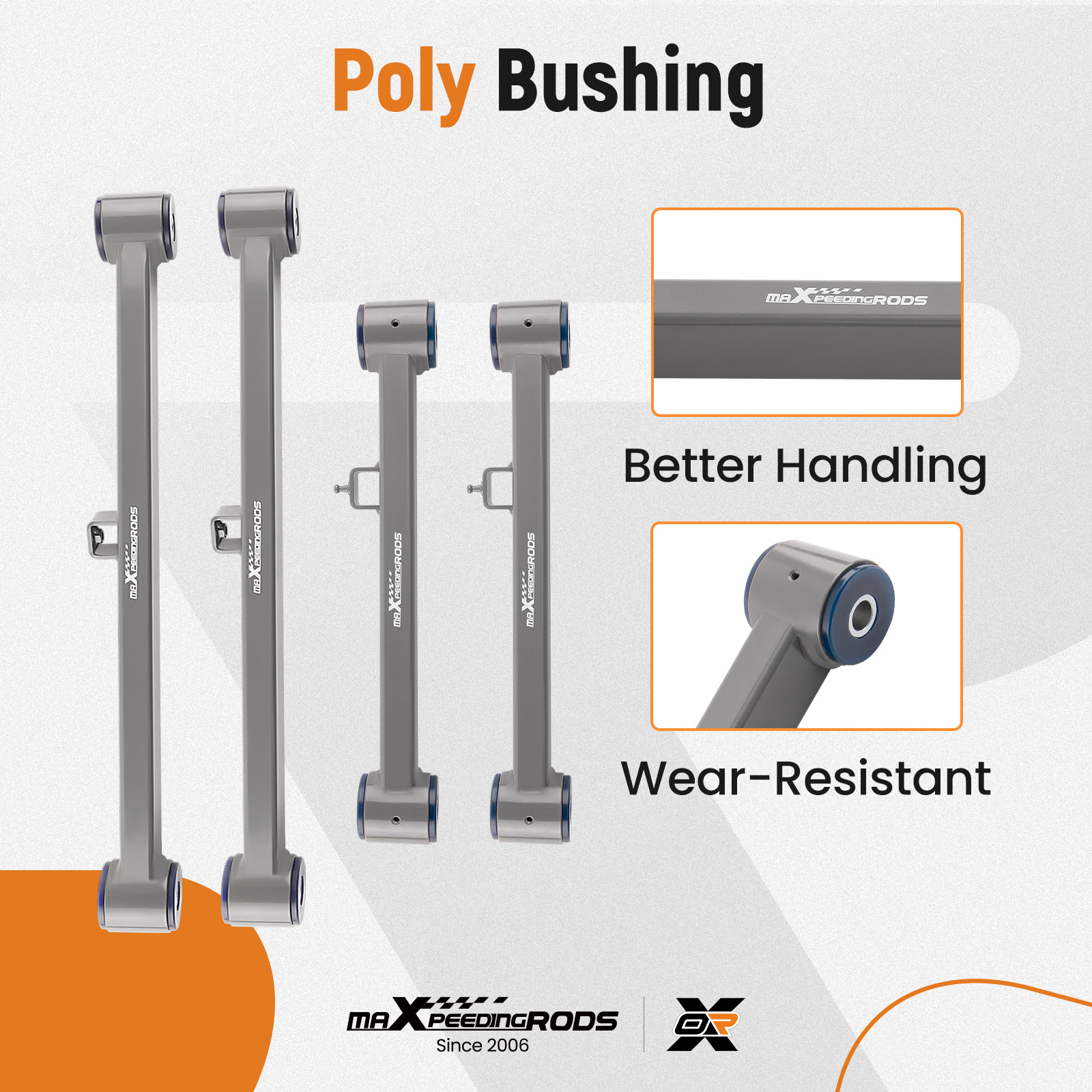 High-quality poly bushings reduce abnormal squeaks and vibrations while driving, eliminate uneven tire wear, and allow you to enjoy a comfortable ride with ease