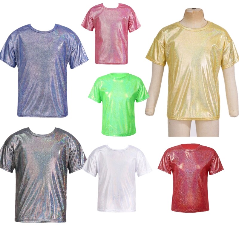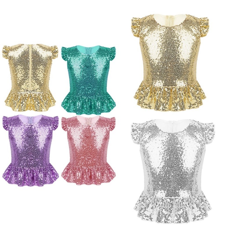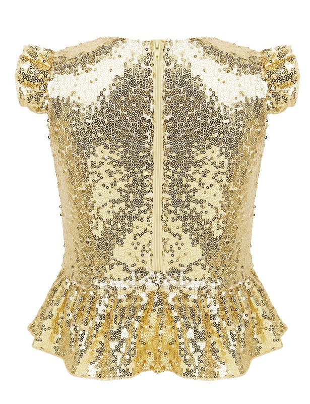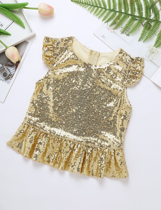 Short flutter sleeves, round neck. Allover is decorated with shiny sequins. Ruffled hem.