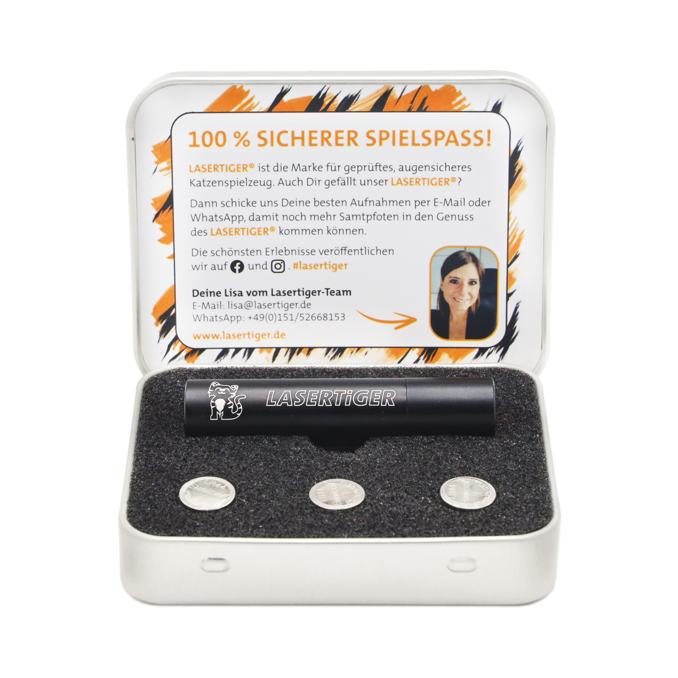 Ein Muss für alle Katzenliebhaber: Mit unserem Klassiker - in praktischer Metalldose, mit Geschenkverpackung und zwei Ersatzbatterien-Packs - erwirbst Du ein hochwertiges und 100% augensicheres Katzenspielzeug für den ultimativen Spielespaß. Der rote LED Pointer ist optimal auf das Augenlicht der Katze abgestimmt. Die Interaktion mit dem einfach bedienbaren Spielzeug ist abwechslungsreich und fördert den Jagd- und Spieltrieb sowie die Bewegung und Fitness Deiner Katze. Übrigens: Der LASERTIGER® ORIGINAL eignet sich auch wunderbar als Geschenk zum Geburtstag oder zu anderen Anlässen.