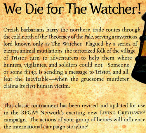 For sale is the Dungeons & Dragons adventure module The Fright at Tristor. It was produced in 2000 for those part of the RPGA Network and features 32 pages dedicated to adventure for characters just starting out - See the 2nd photo provided for a detailed description.