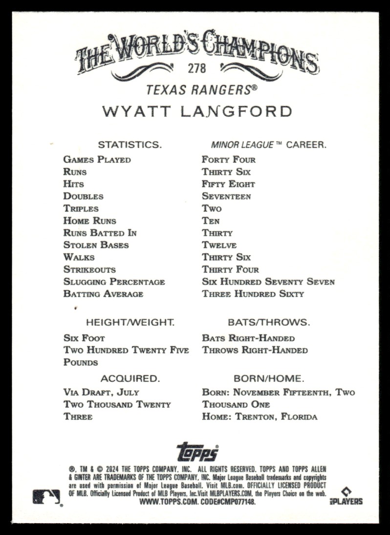 | WYATT LANGFORD 2024 Topps Allen & Ginter Rookie Card RC #278 Texas Rangers |