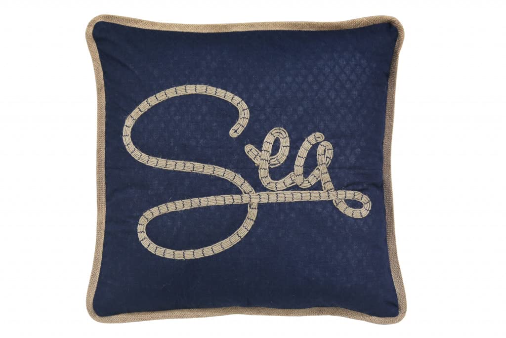 The 17" x 17" navy blue and brown text zippered polyester and burlap blend throw pillow with embroidery is the perfect decorative accessory for your home. Great to use on its own or mix with other decorations for the perfect look. A great decorative accessory for your favorite chair, to accent your sofa, or to use as part of your bed ensemble. 4" H x 17" W x 17" D
