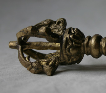 | Donnerkeil und Glocke - die Methode und die Weisheit Der Dorje (in der rechten Hand) ist zusammen mit der Glocke (Ghanta oder Drilbu - in der linken Hand) das Symbol das zur Erleuchtung führt: ''Weg und Ziel sind eins'' |