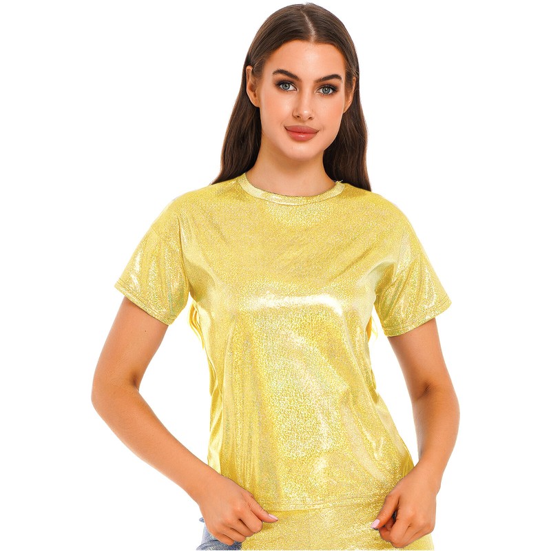 Short sleeve t-shirt for women, metallic shiny surface, makes you fashion and eye-catching in the crowd.
