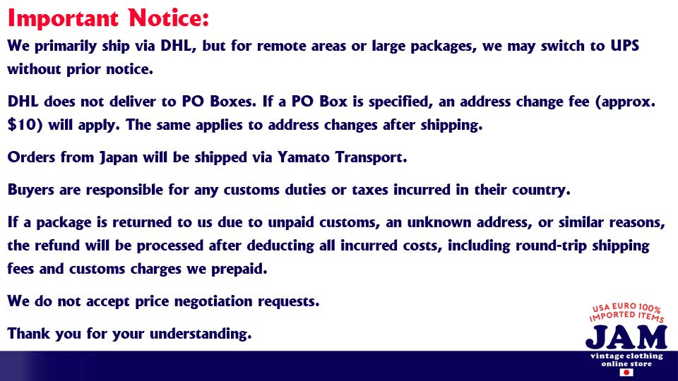We price vintage clothing based on our evaluation, considering factors such as market trends, rarity, size, and age. Prices may vary for the same item depending on the listing timing. Prices are subject to change without notice. We do not accept price negotiations.