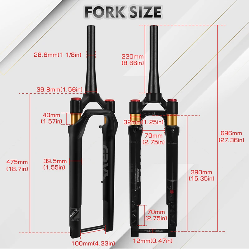 【Lightweight】Air suspension fork, compared with the bulky mechanical fork air fork reduces the weight of the fork and improves the damping effect. Tip: You can refer to the air pressure table on the fork and set the right air pressure value according to your weight.
