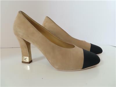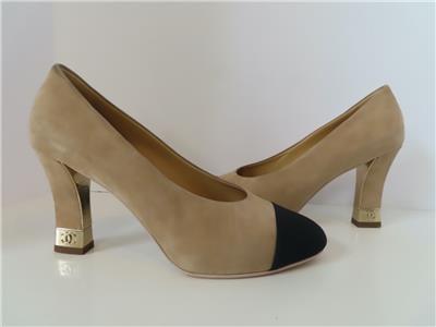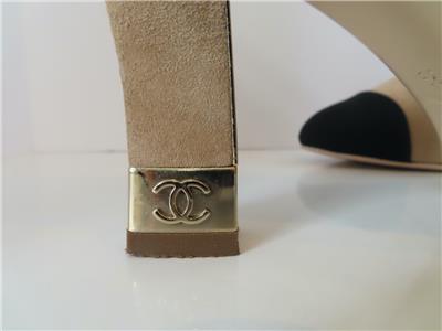 - Heel: Chunky Beige Suede Heel with Gold Metal Logo Accent