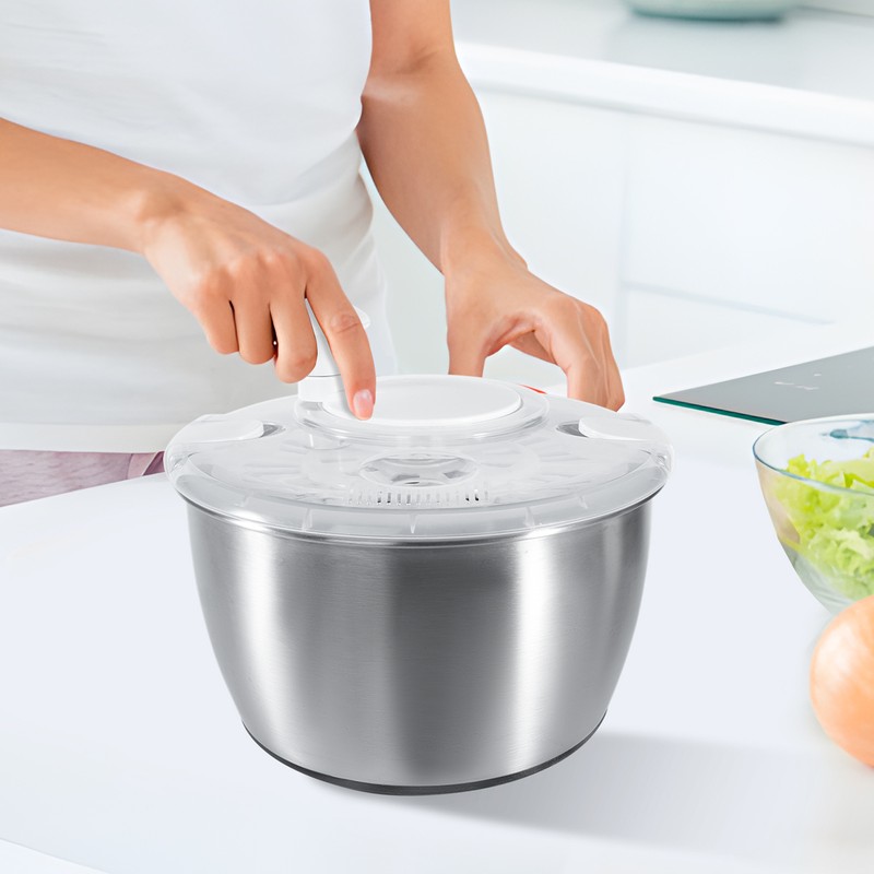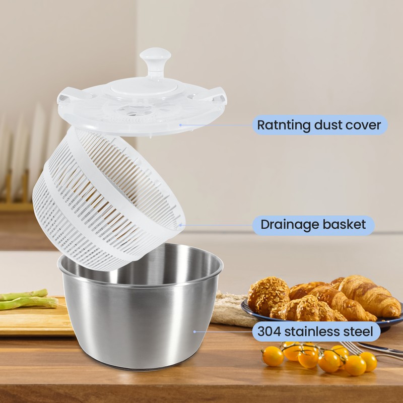 Hohe Qualität:Salatschleudern Die Salatschleuder besteht aus Edelstahl, der hygienisch, geruchs- und geschmacksneutral und leicht zu reinigen ist. Und der Bezug ist zur gründlichen Reinigung abnehmbar.