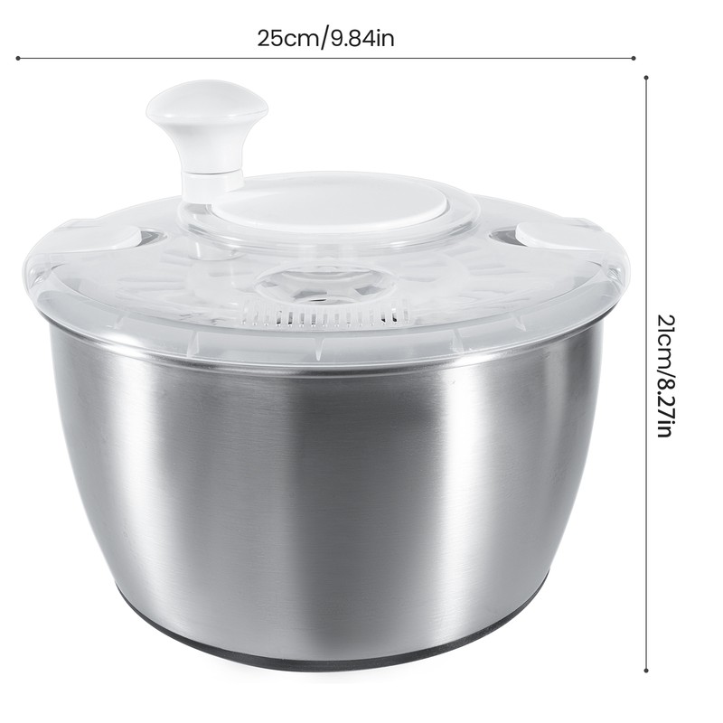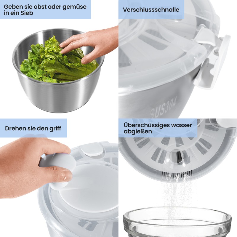 Einzigartiges Design:Salatschleuder klein Die Salatschleuder wird mit einem Außenbehälter aus Edelstahl und einem Abtropfkorb geliefert. Drehen Sie einfach den Griff, um den Korb zum Schleudern und Trocknen anzutreiben.