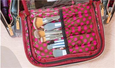 - Plastic lined interior zip pouch with 5 elastic brush holder slots