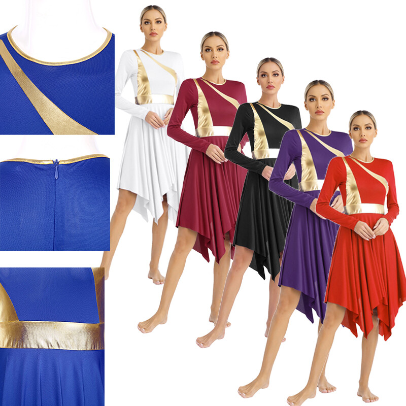 Women’s long sleeve dance dress with contrast color patchwork design creates an eye-catching effect and makes you stand out.
