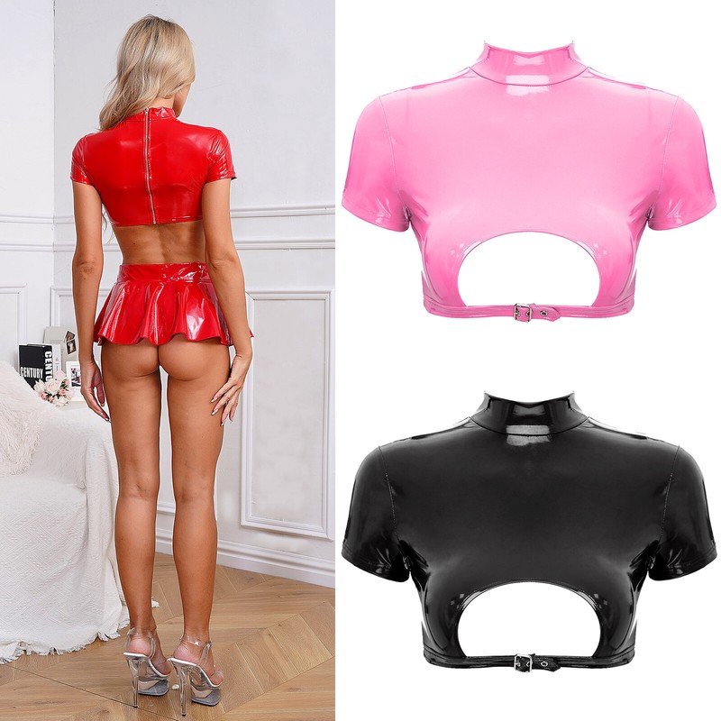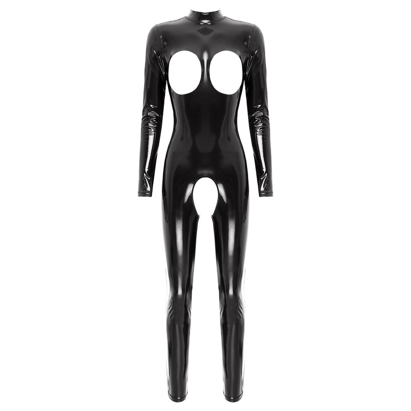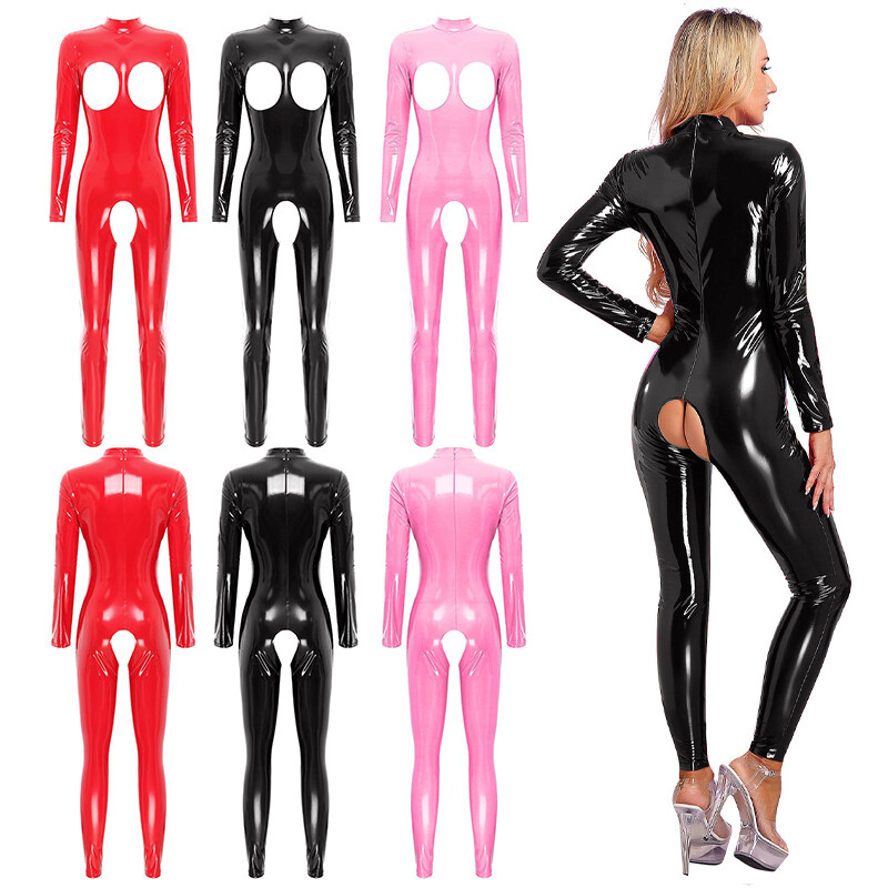 Womens Bodysuit Patent Leather Womens Jumpsuit Long Sleeve One Piece Leotard