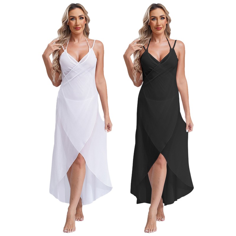 See-through sheer mesh design with spaghetti shoulder straps, deep u neck and backless, solid color, pull on closure.