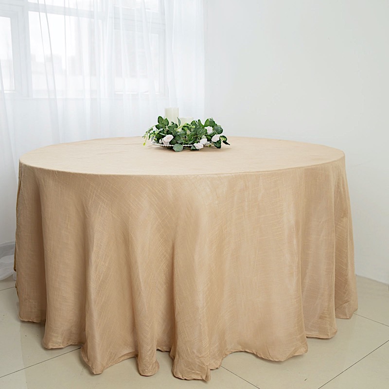 Crafted from high-quality polyester fabric with a textured woven design, this jute-like tablecloth will bring a rustic charm to your celebration.