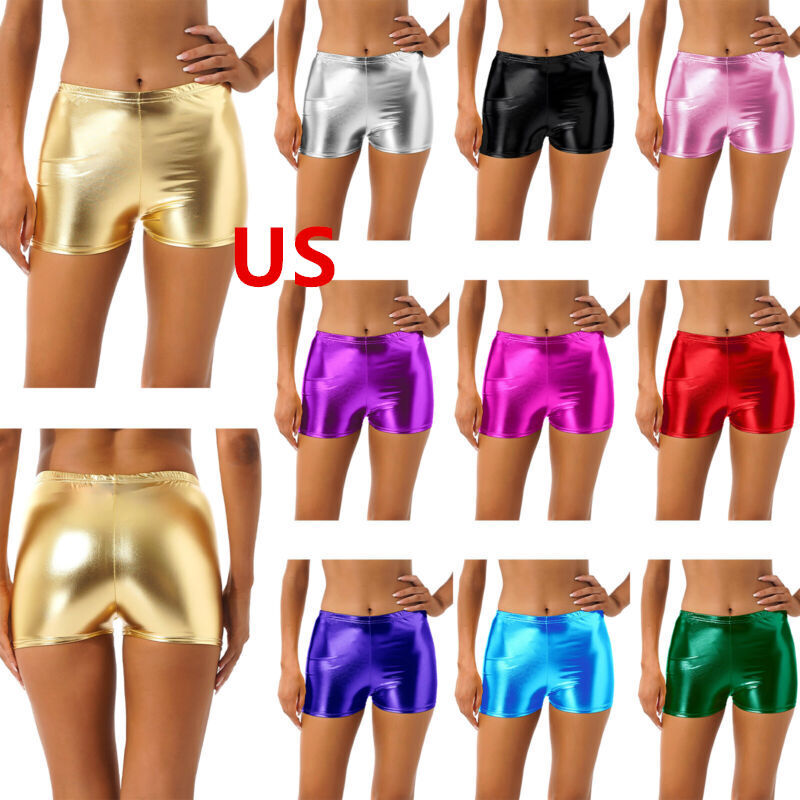 Womens Glossy High Waist Shorts Elastic Waistband Short Leggings Sports Bottoms.