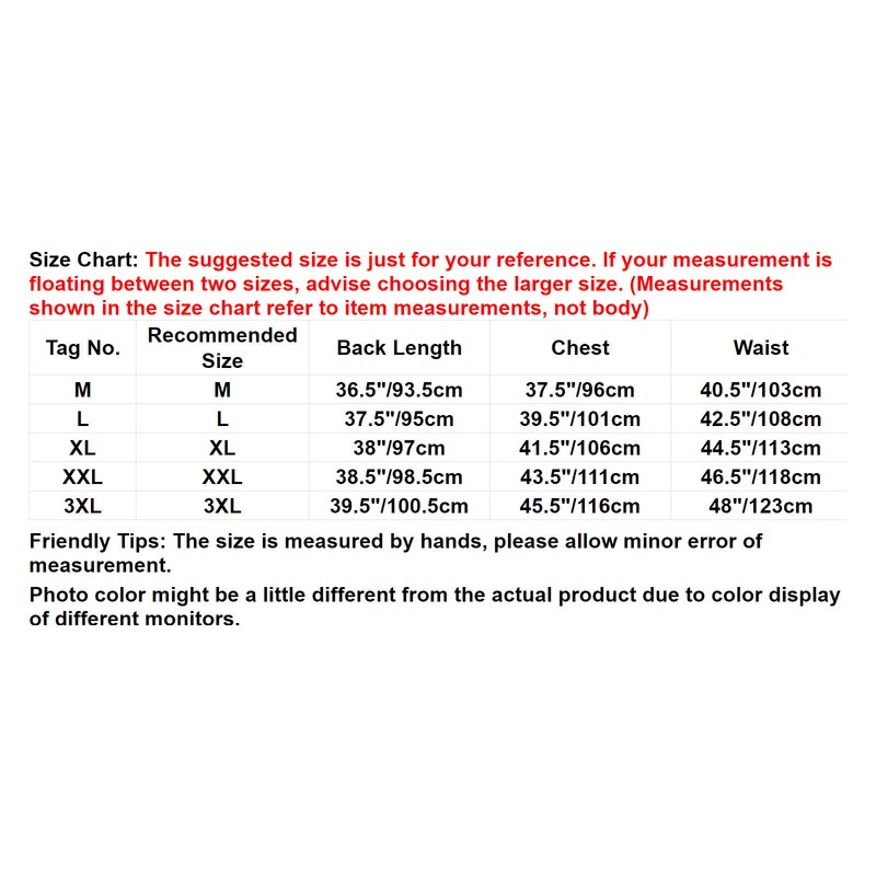 | Tag No. | Recommended Size | Back Length | Chest | Waist |