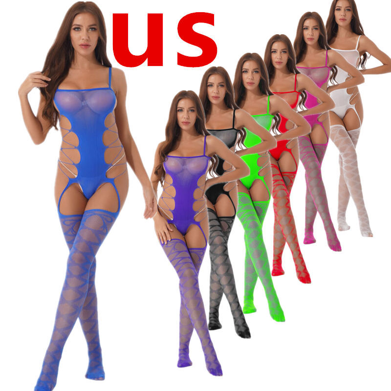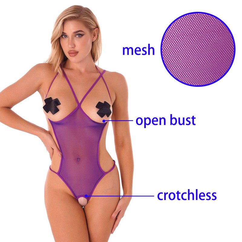 Womens See-through Mesh Crotchless Bodysuit Hollow Out Halter Backless Leotard Lingerie Nightwear.