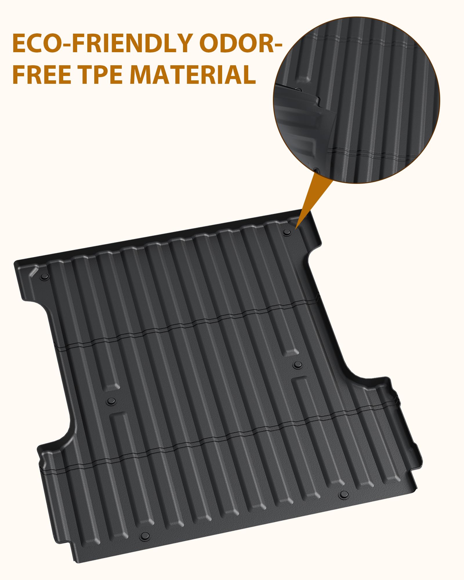 ECOFRIENDLY TPE: Our truck bed mats crafted from environmentallyfriendly TPE (thermoplastic elastomer) material,the truck bed mat is free from harmful chemicals and toxins.odor-free and safe for use.